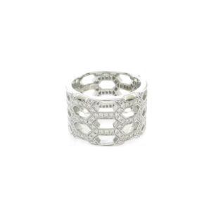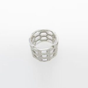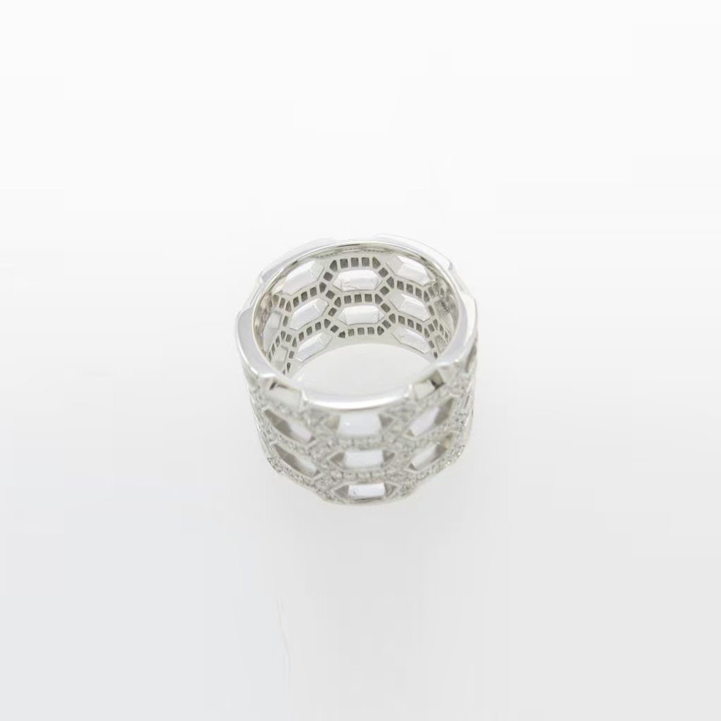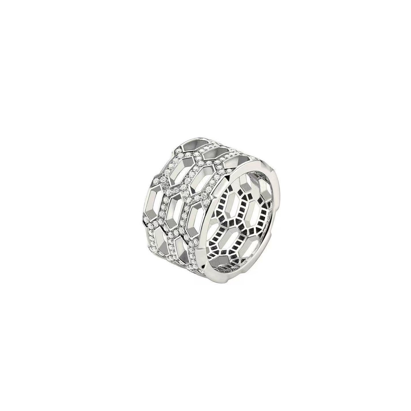 The design is inspired by the intricate structures found in nature, with a three-dimensional honeycomb shape that exudes a futuristic feel. The wide band of the ring adds to its presence without being overpowering, making it suitable for everyday wear paired with a suit, while also making it perfect for adding a touch of luxury when layered with other pieces at a formal event! The brilliance of the diamonds shifts with different angles, as if a starry patch is hidden in the tip of the finger.