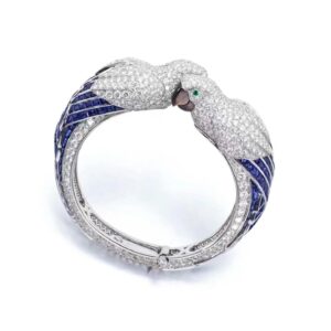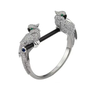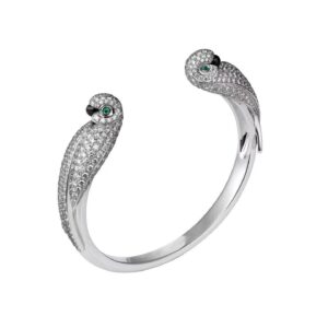 This is a stunning piece in the r high-end jewelry collection! The 18K gold parrot-shaped bracelet features natural diamonds, seamlessly blending tropical flair with high-end jewelry. Every feather on the parrot’s wings is adorned with diamonds, making it seem as though the bird is about to take flight on one’s wrist—it’s as if one can bring the entire jungle with them wherever they go!